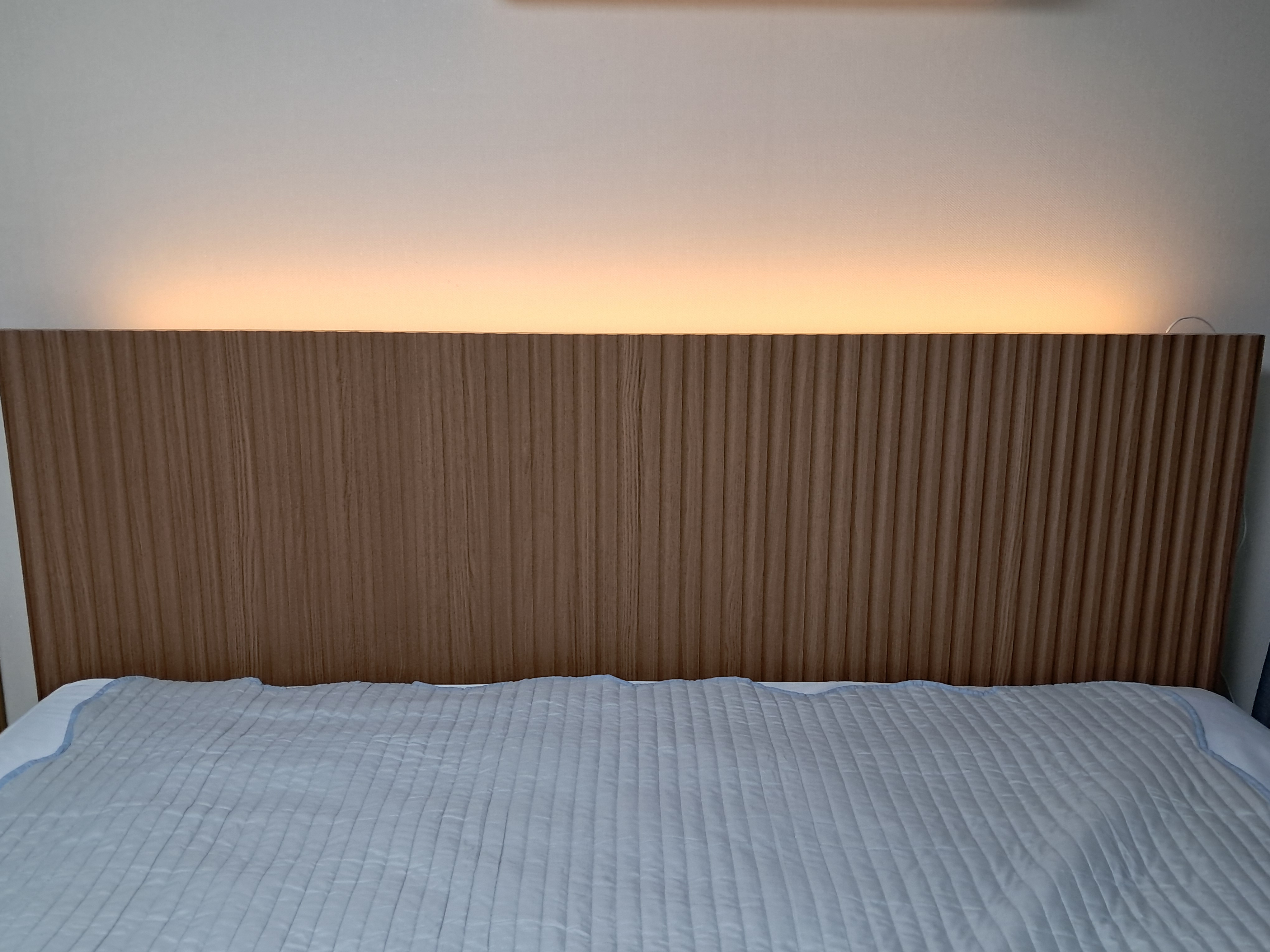에이스침대 헤드보드의 은은한 간접조명이 침실 전체를 부드럽게 감싸주어 하루를 마무리하는 시간이 한층 편안해졌습니다.