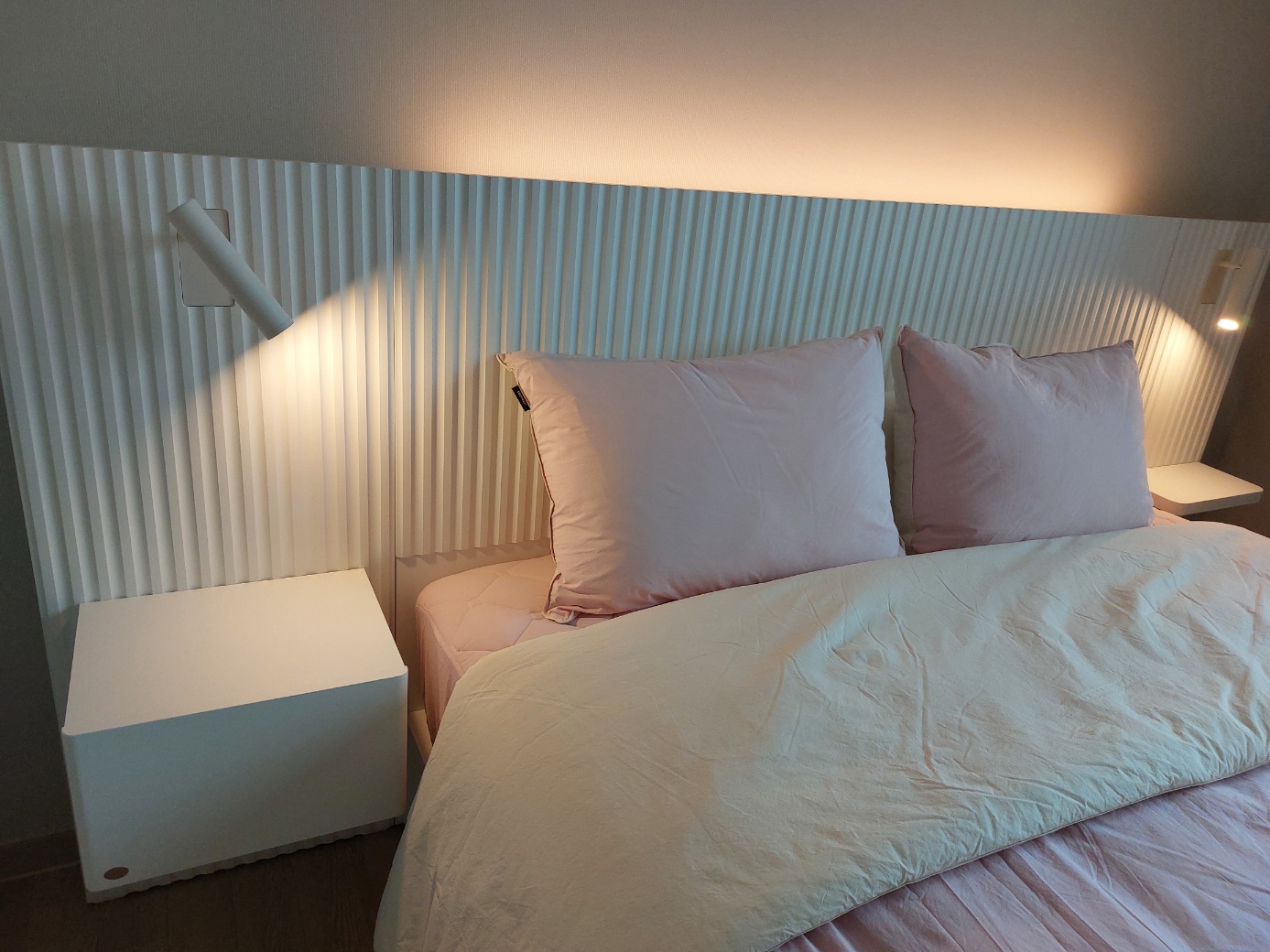 화이트 컬러에 은은한 주광색 조명이 침실 분위기를 압도합니다. 저희는 핑크색 침구로 베딩했는데, 너무 잘 어울립니다!!