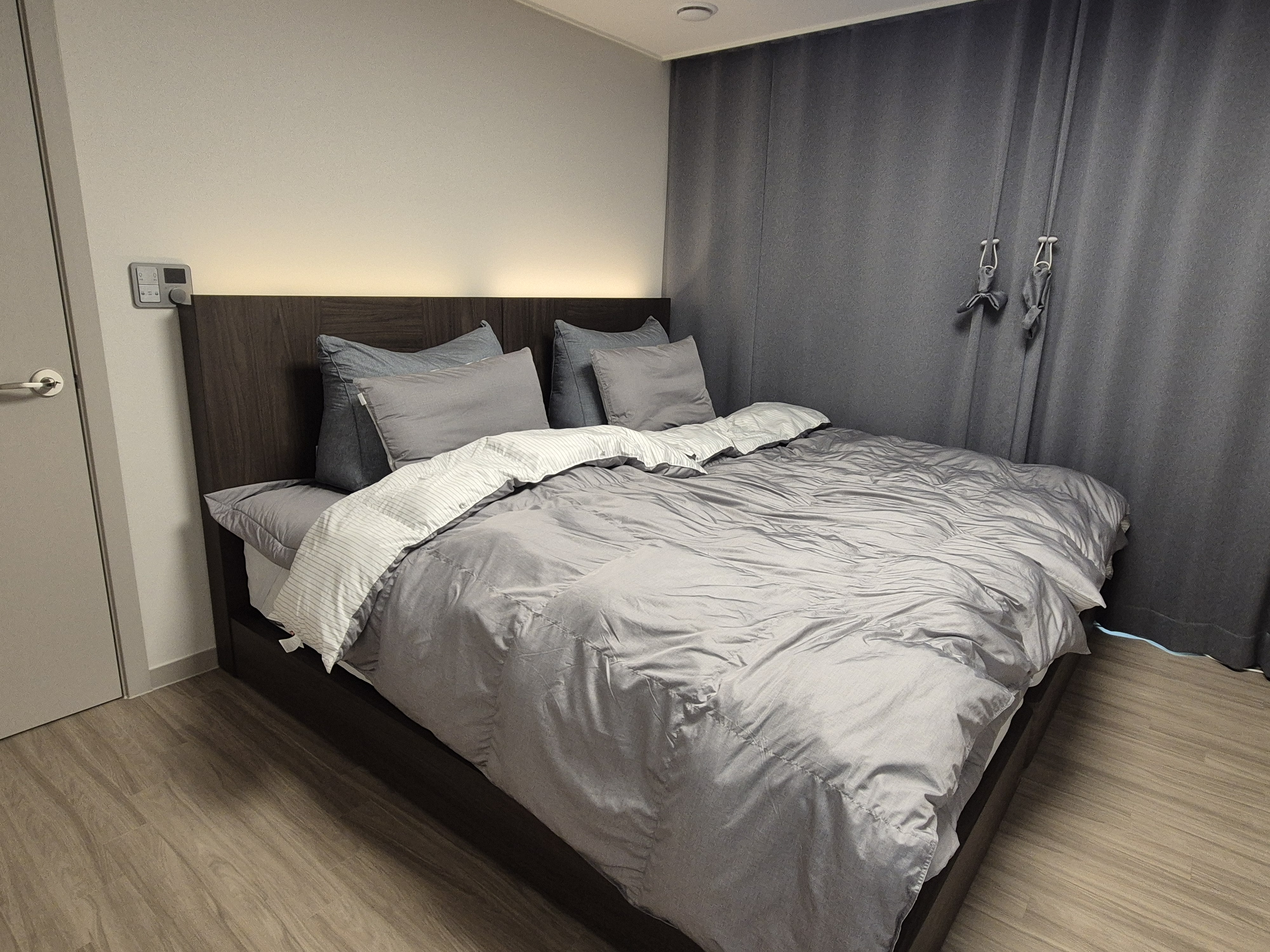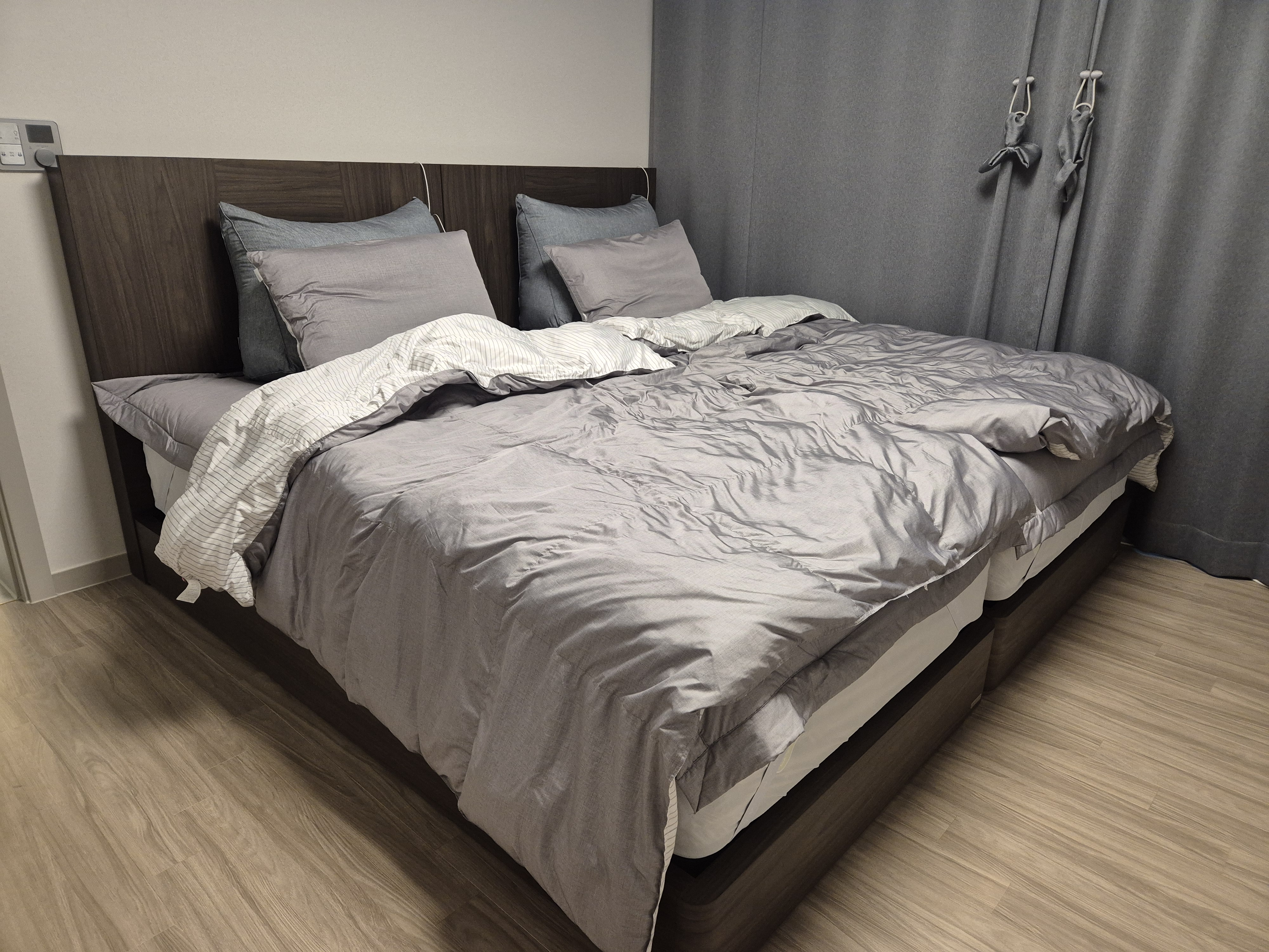 저의 로망이 호텔형 침대였는데 결혼 10년만에 새집으로 이사를 가면서 로망을 실현하게 되었네요. 세트로 산 바론트 프레임도 고급스럽고 헤드부분에 휴대폰 충전도 가능해서 편리합니다. 바닥 마루 색깔이 짙어서 이것 또한 집이 너무 어두워 보일까 걱정했지만 막상 설치 하고보니 괜한 걱정이었던듯 너무 예쁘네요.