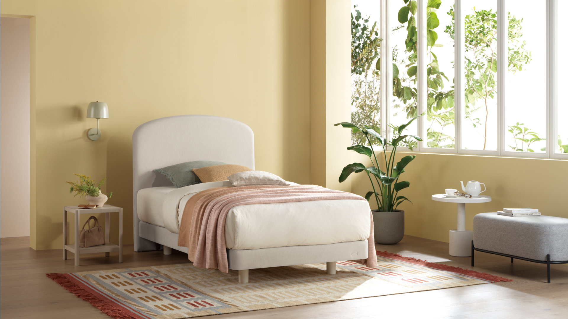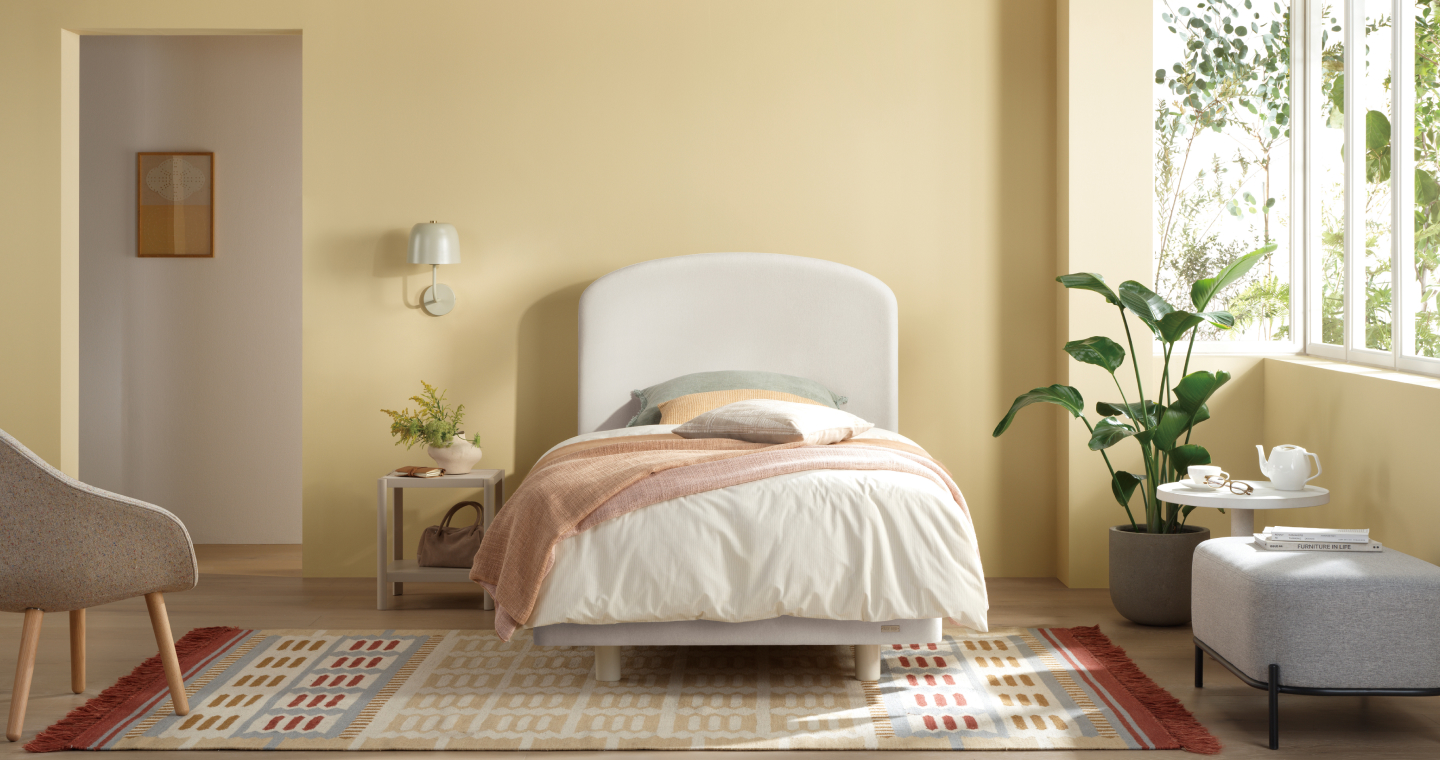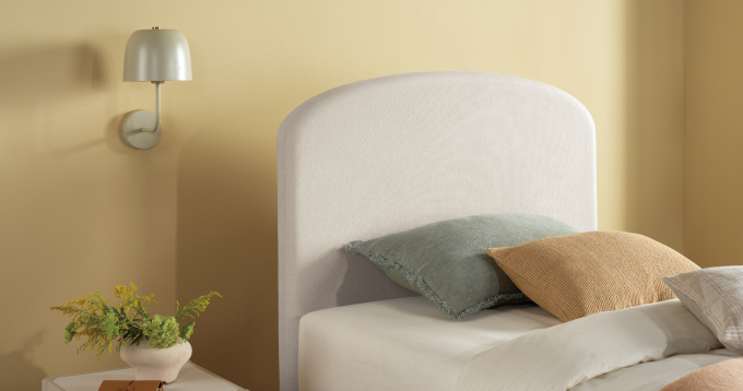 아담한 사이즈와 곡선형 실루엣이 공간에 따뜻한 분위기를 더하고, 1,209mm 높이의 헤드보드는 침실에 안정감을 완성합니다.