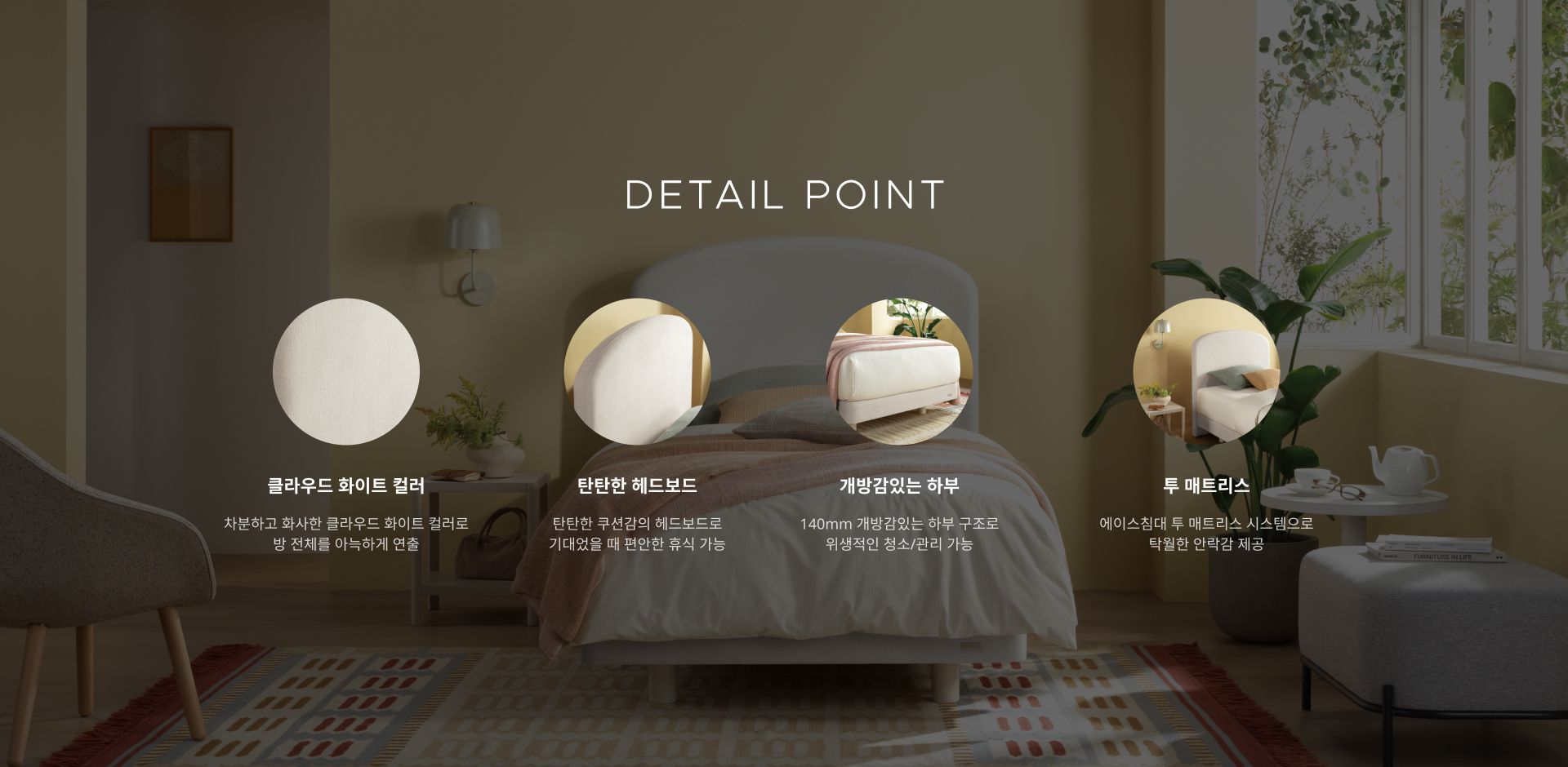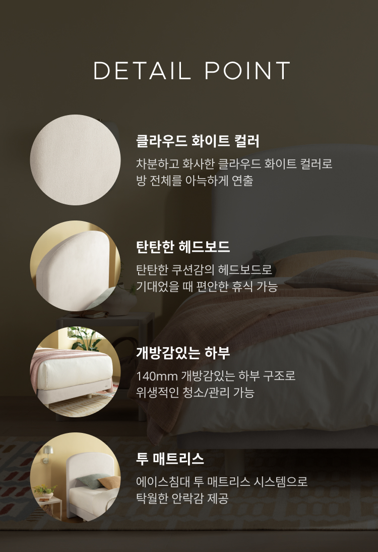 편안하게 등을 받쳐주는 헤드보드와 에이스침대의 투 매트리스 시스템이 어우러져 호텔처럼 안락한 휴식을 선사합니다.
