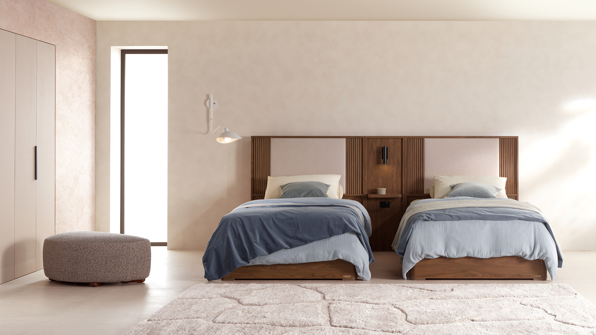 NOVELLA는 입체적인 템바보드와 부드러운 패브릭 쿠션의 조화로 완성된 모던 디자인의 침실입니다.