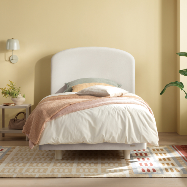둥근 라운드 쉐입과 클라우드 화이트 패브릭이 어우러진 싱글 침대로, 침실에 포근하고 아늑한 분위기를 더합니다.