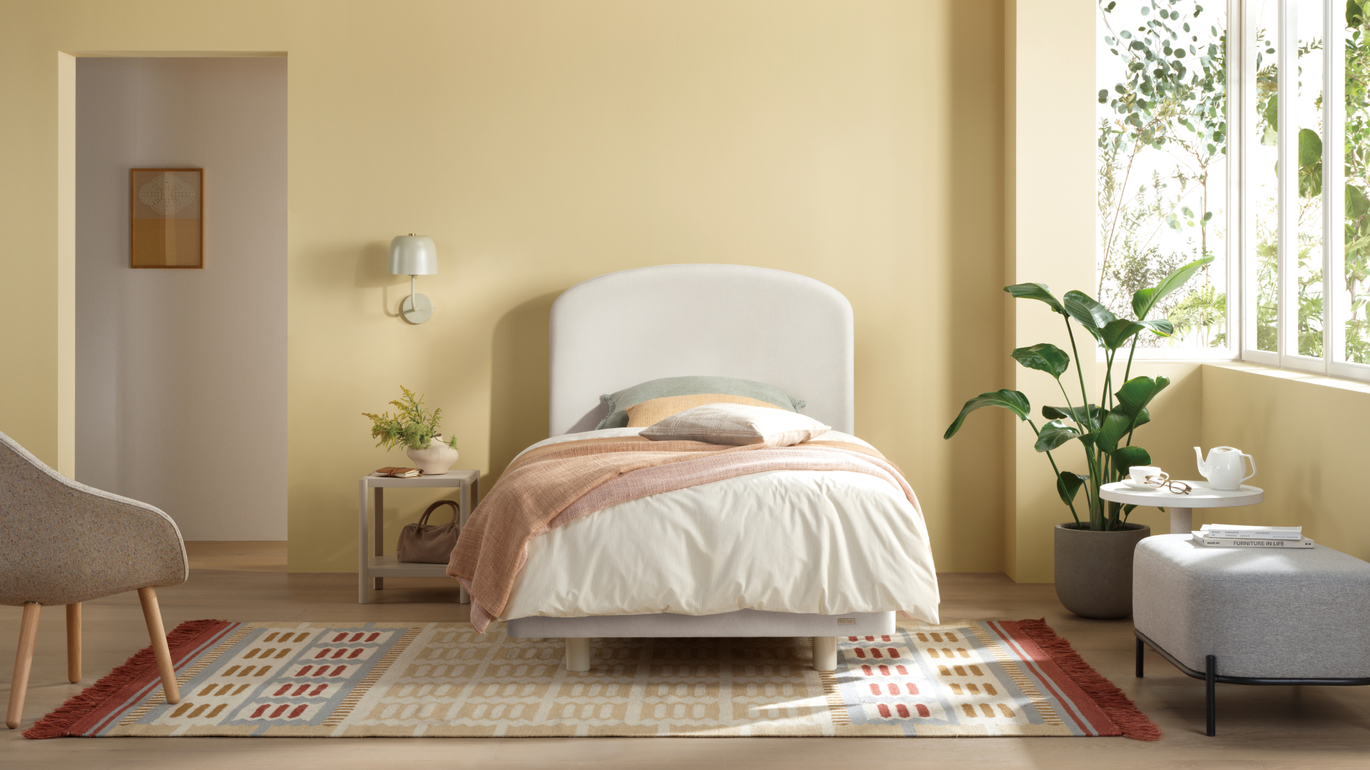 아담한 사이즈와 곡선형 실루엣이 공간에 따뜻한 분위기를 더하고, 1,209mm 높이의 헤드보드는 침실에 안정감을 완성합니다.