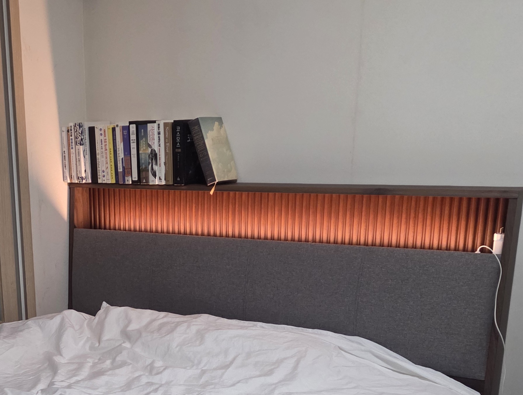 디자인: 일단 매우 모던하고, 감각적이며, 은은한 조명이 어울어져 방의 분위기를 한층 돋보이게 합니다. 특히 헤드 보드에 작은 소품을 수납할 수 있고, USB 포트가 있어 충전도 용이합니다.