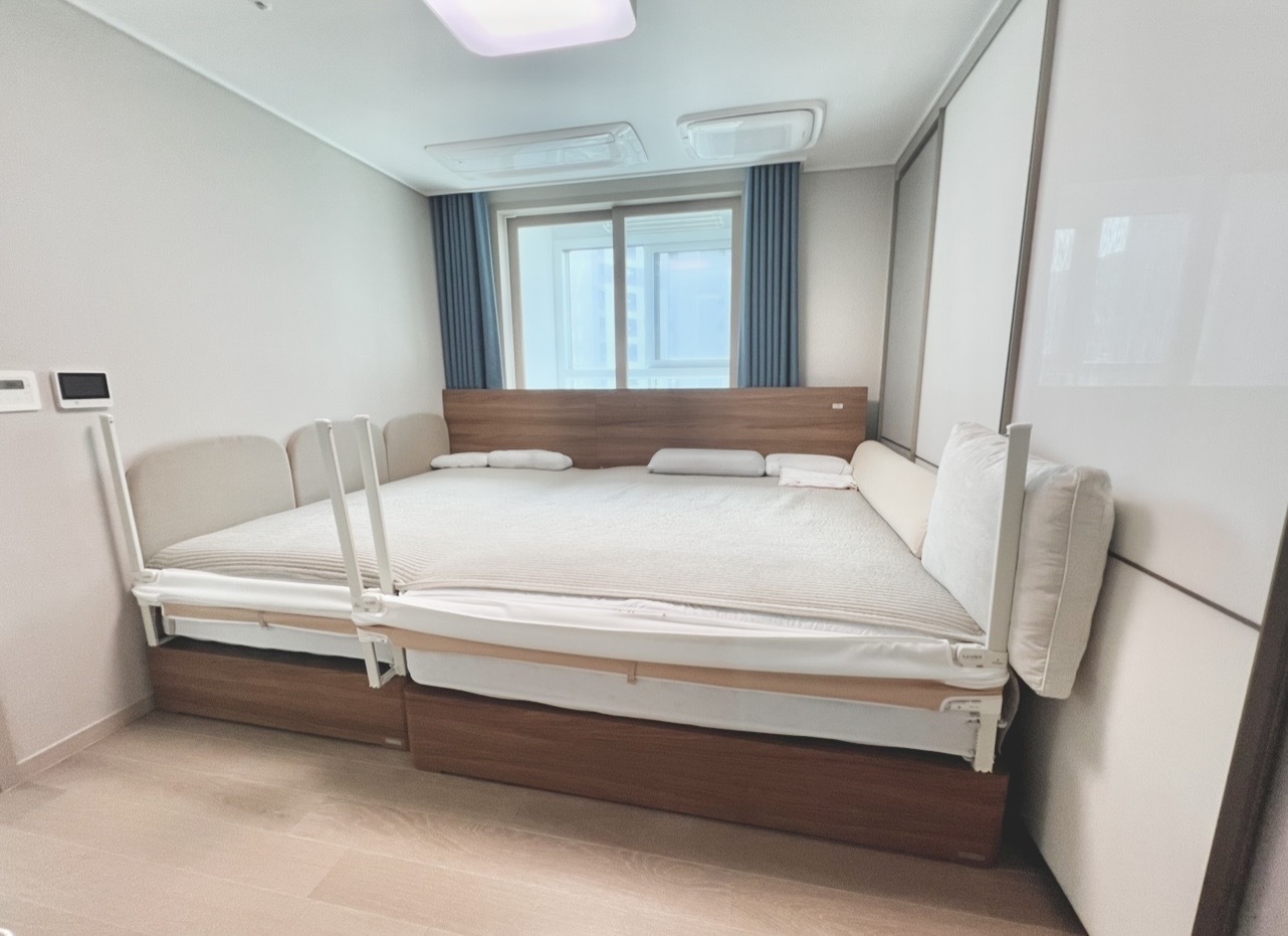 라지 킹과 슈퍼싱글 사이즈 조합의 패밀리 침대라 안방에 꽉 차게 자리했지만 다행히 콤팩트한 침대 프레임 덕에 슬라이드 옷장까지 사용할 수 있게 되어 매우 만족하며 사용하고 있습니다.