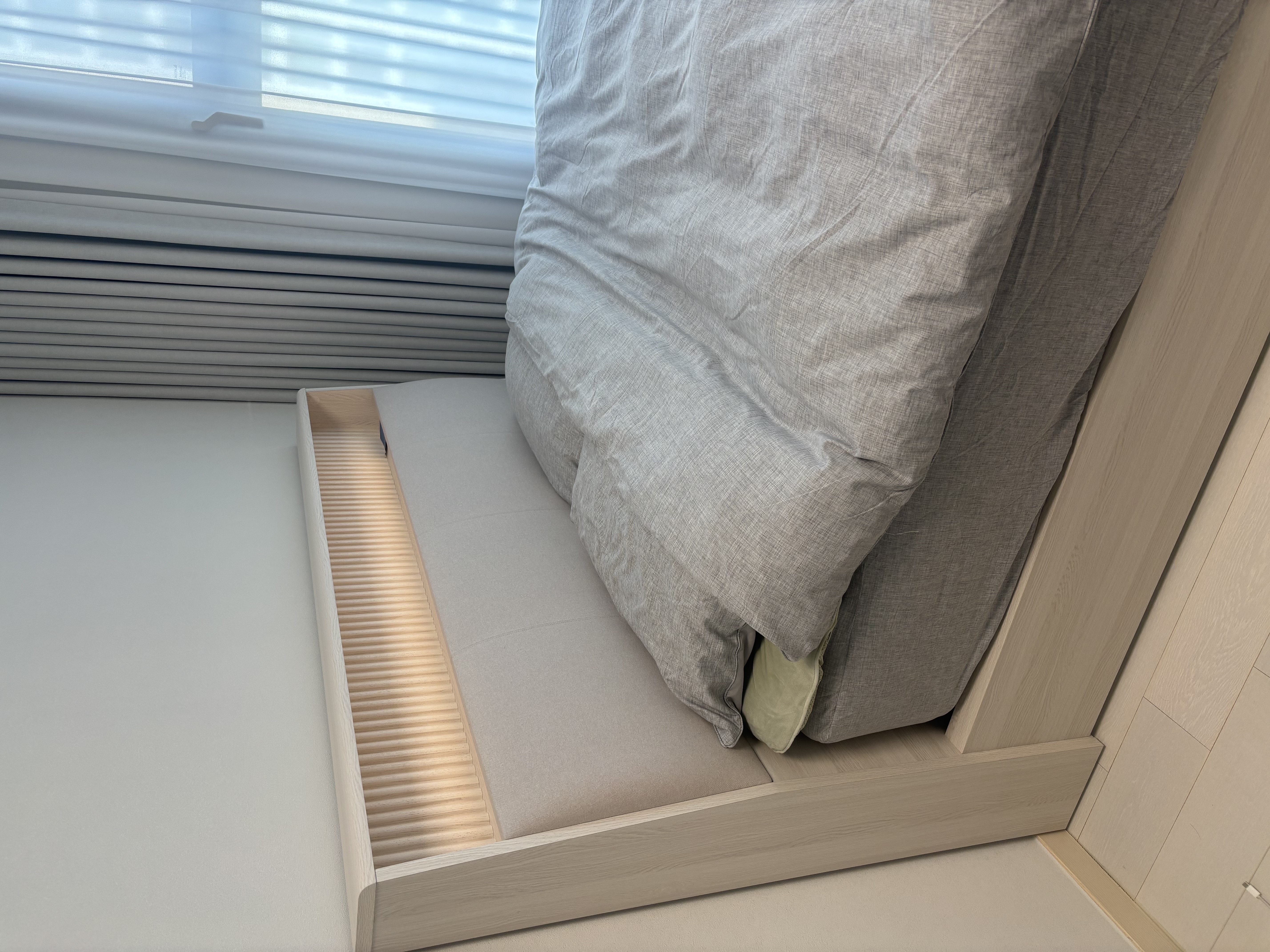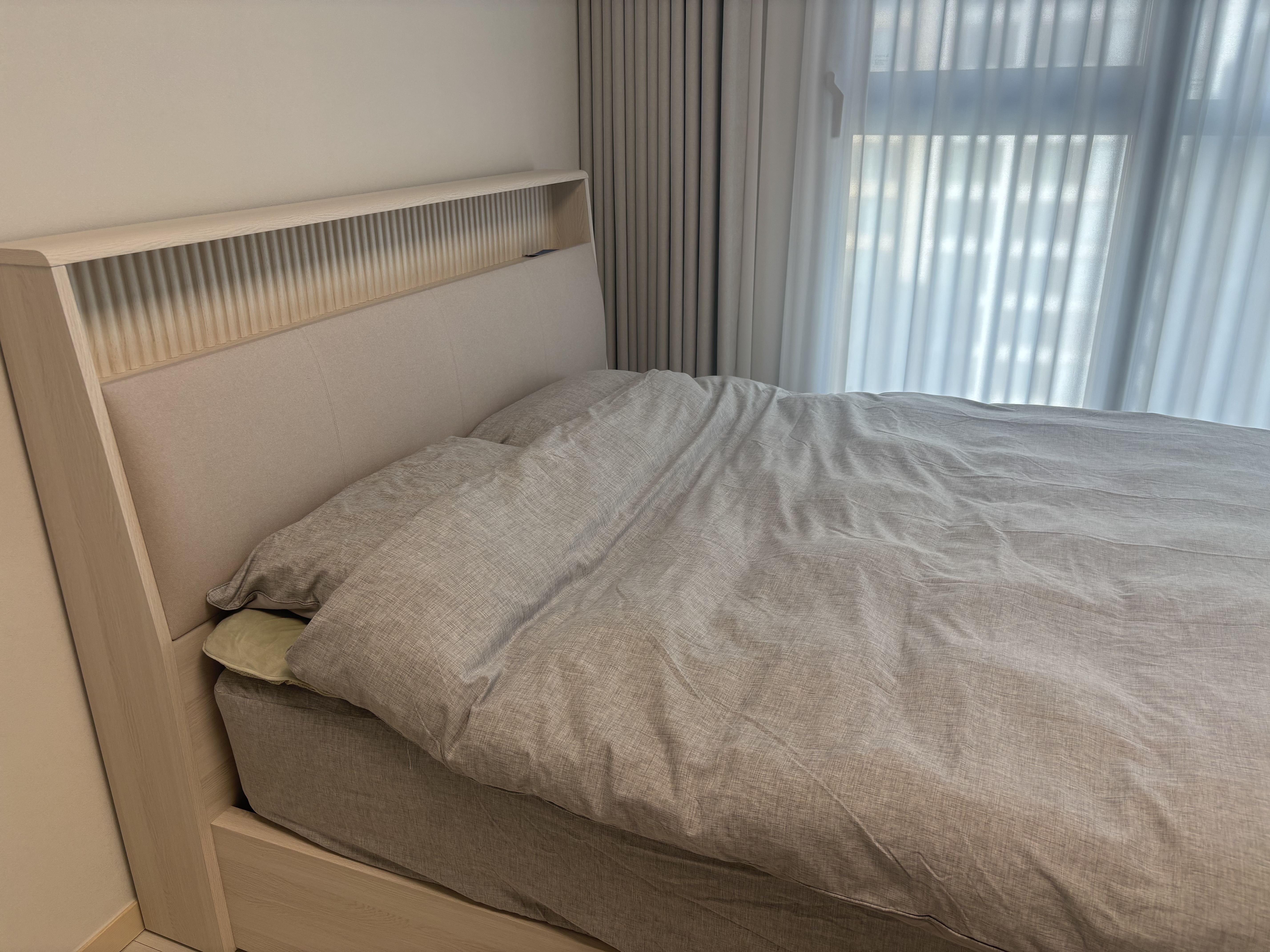 화이트 계열의 프레임을 찾다가 눈에 들어온 LUCE3 화이트! 대리점 전용이라 전시되어있는 곳 찾는라 고생 좀 했지만 이사 온후 가장 잘산템중 하나요♡ 이사온 집이 화이트 계열 인테리어라 포인트가 되는 브라운계열의 루체로 할까 고민하기도 했지만 집이랑 너무나 잘 어울려 보기만 해도 기분 좋아지네요~ 하드 타입 매트리스를 원해서 듀오테크3으로 할까 하다 최종적으로 매니저님이 추천해주신 레규러 타입의 하이브리드테크3으로 선택했는데 이 매트리스 사용하고난후 남편이 허리 아픈게 사라졌다 할 정도로 편안한 숙면이 가능해서 대만족입니다. 휴대폰 충전도 양쪽 사이드로 가능하고 밤에 LED램프 켜두면 은은한 무드로 기분전환도 되고 앞으로의 침대생활도 기대되네요.
