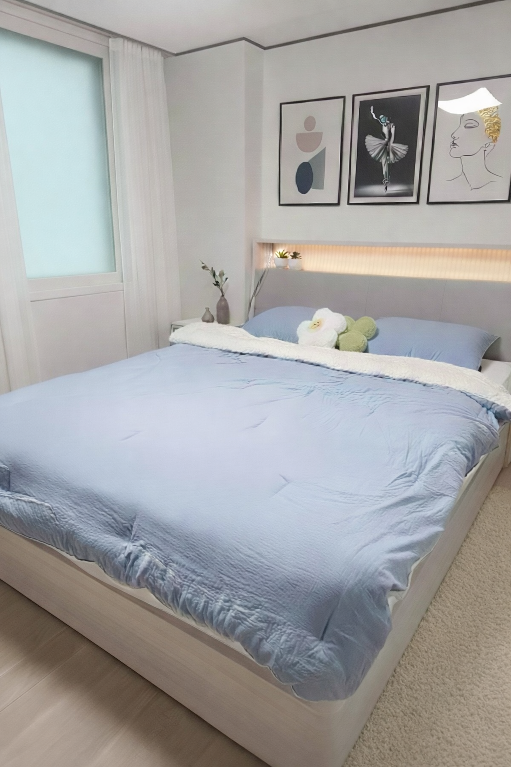 루체3 프레임은 디자인이 과하지 않아서 침실이 답답해 보이지 않고, 헤드 쪽 간접조명도 은은해서 밤에 불 켜두고 있어도 눈부심이 없다. 딱 무드등 정도라 실사용하기 좋다. 폰충전도 가능하다 c타입이 좌우에 하나씩 위치해 있다.