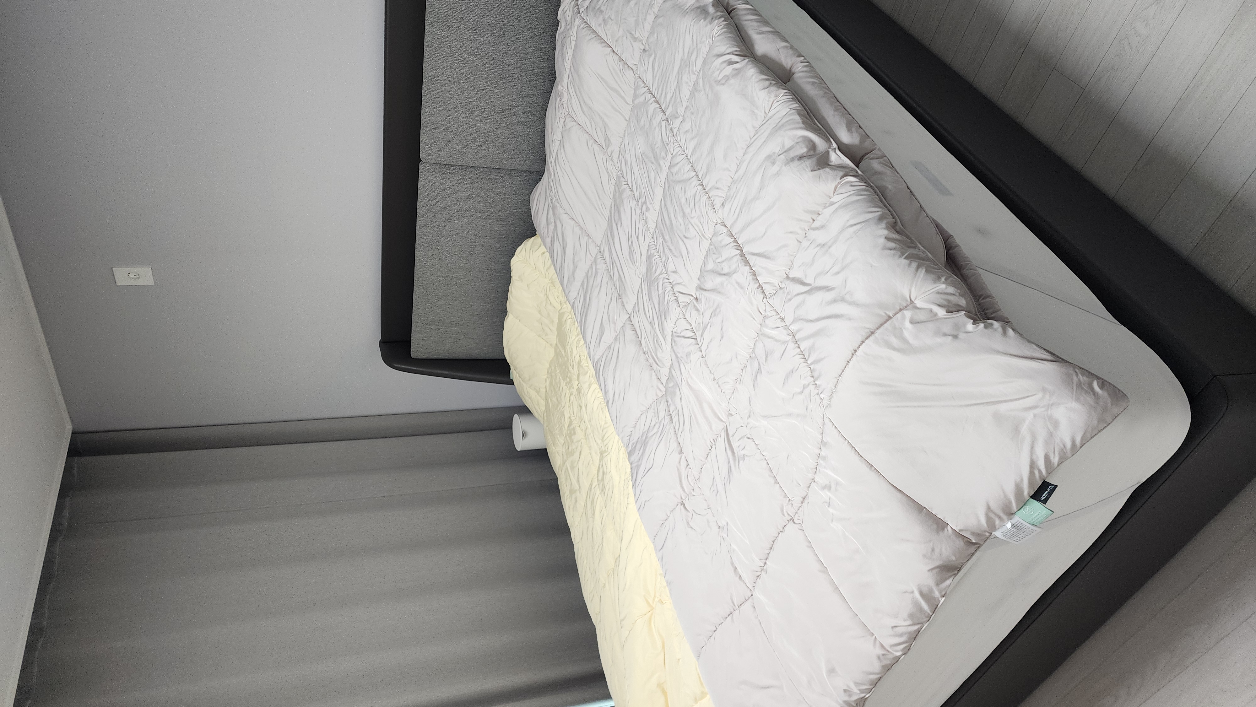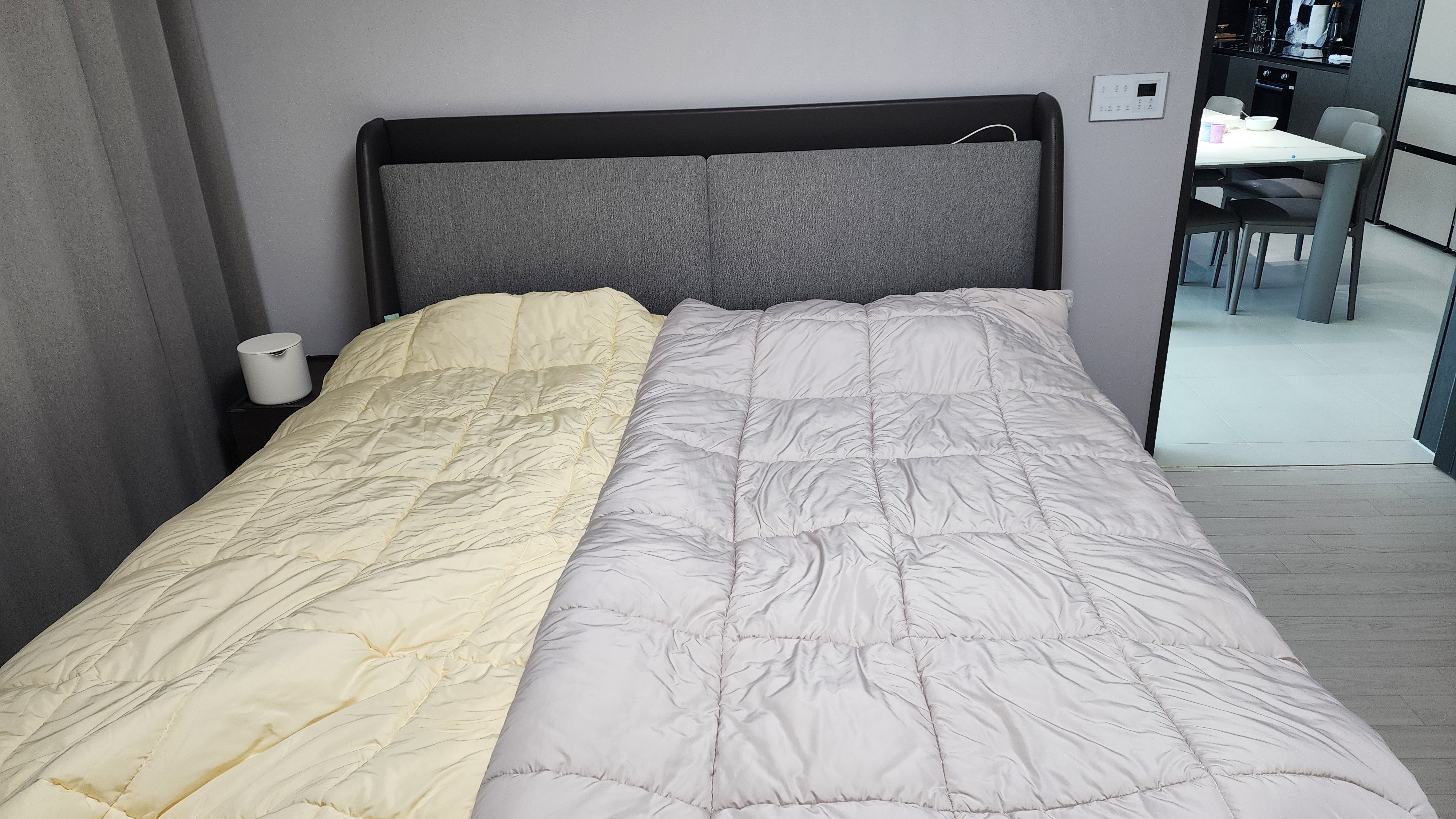 프레임도 너무 고급스럽고 led등이 있어서 밤에 활용도가 아주 좋습니다. 라지킹 사이즈라 부부 둘이 자고 넉넉해서 이불도 각자 사용합니다