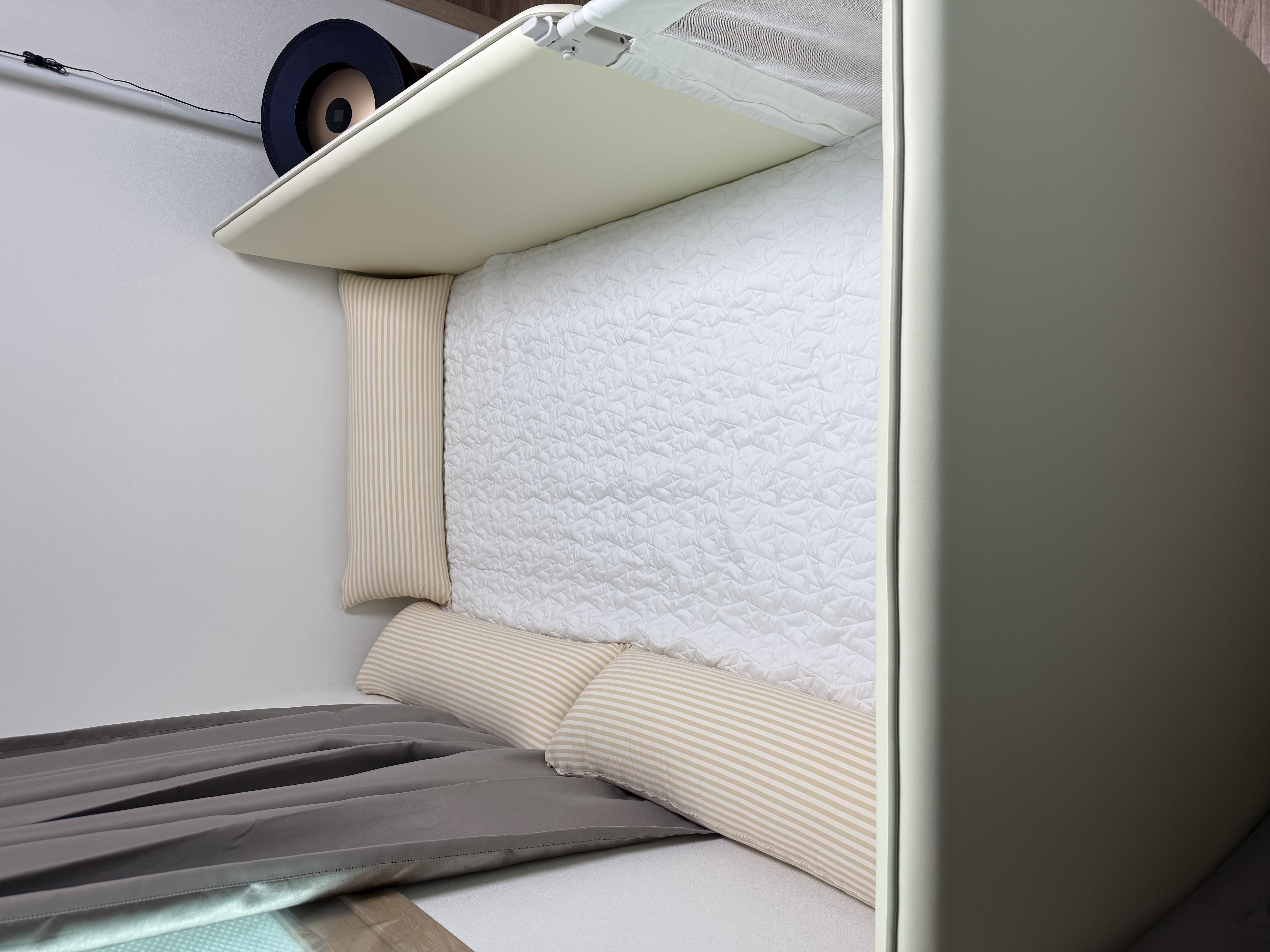 밤에 뒤척임이 잦은 편인데도 소음이나 흔들림이 거의 없어서 수면 방해가 적었고, 부모가 옆에 잠깐 눕기에도 부담이 없었어요. 마감도 깔끔해서 오래 써도 만족도가 떨어지지 않을 것 같고, 전체적으로 신뢰감 있는 아기 침대라는 느낌이 확실했습니다.