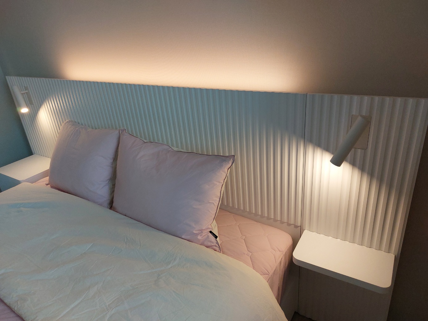 화이트 컬러에 은은한 주광색 조명이 침실 분위기를 압도합니다. 저희는 핑크색 침구로 베딩했는데, 너무 잘 어울립니다!!