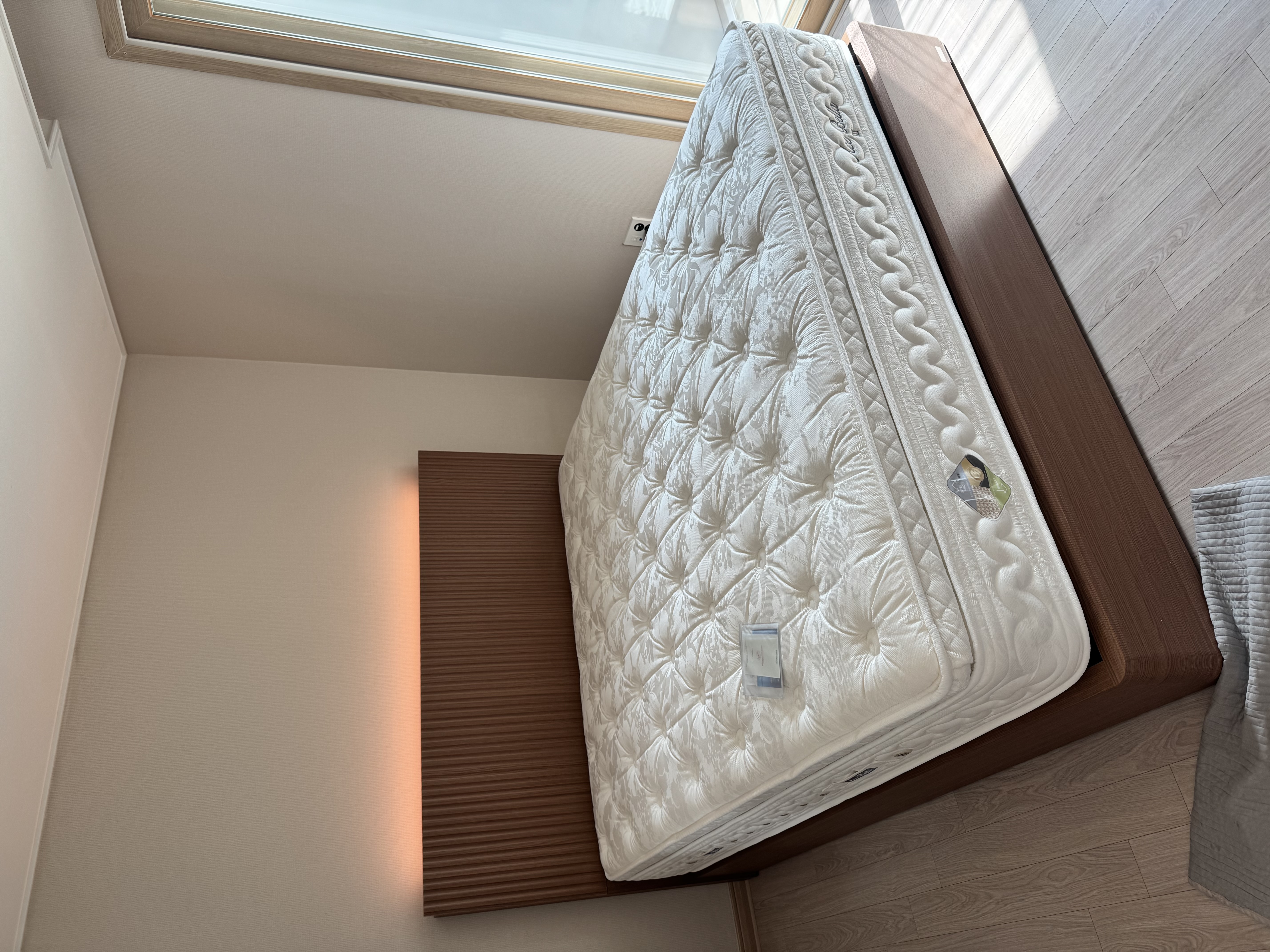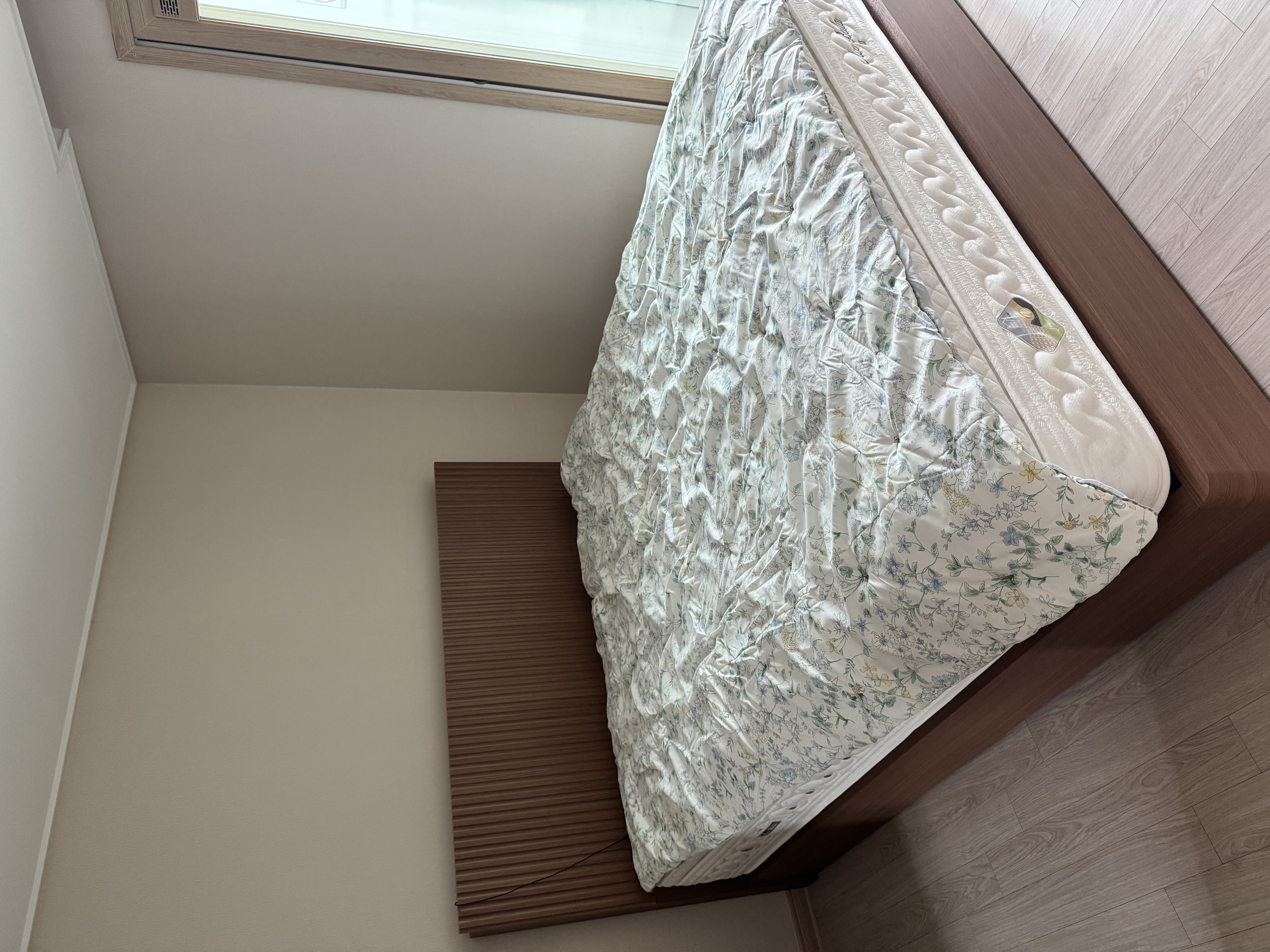 매트리스와 침대 프레임을 함께 구매했는데 전체적으로 매우 만족스럽습니다. 먼저 침대 프레임은 원목 느낌의 디자인이 깔끔하고 고급스러워서 침실 분위기를 한층 더 따뜻하게 만들어 줍니다. 헤드보드 뒤쪽에 은은한 간접조명이 들어와 밤에 조명을 켜면 호텔 같은 느낌이 나서 특히 마음에 들었습니다. 전체적인 마감도 탄탄하고 흔들림이 없어 안정감이 느껴집니다.