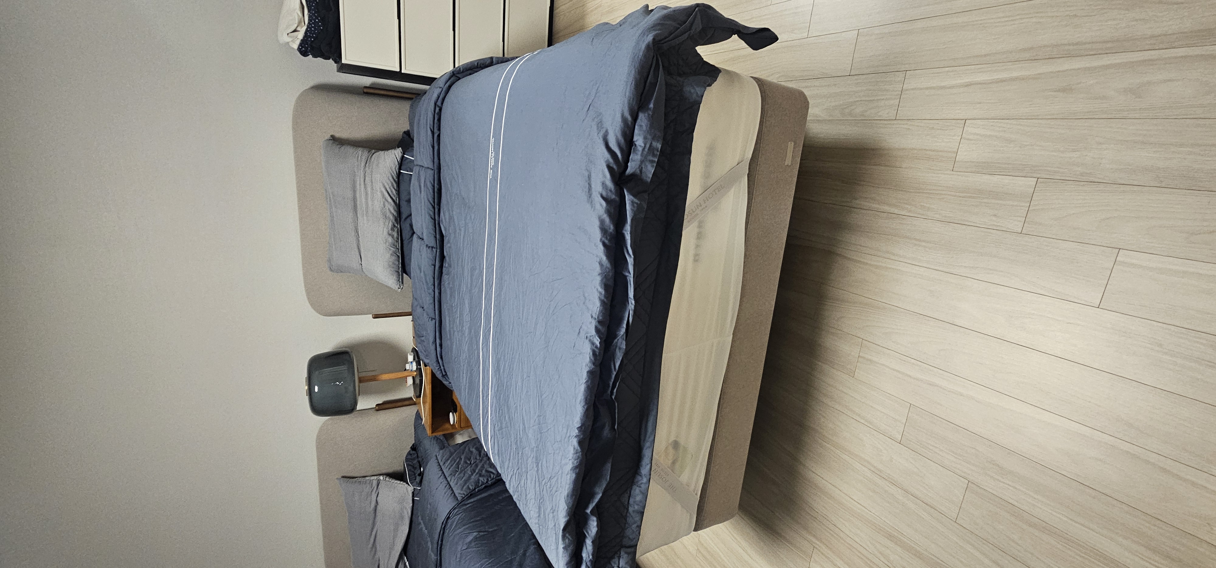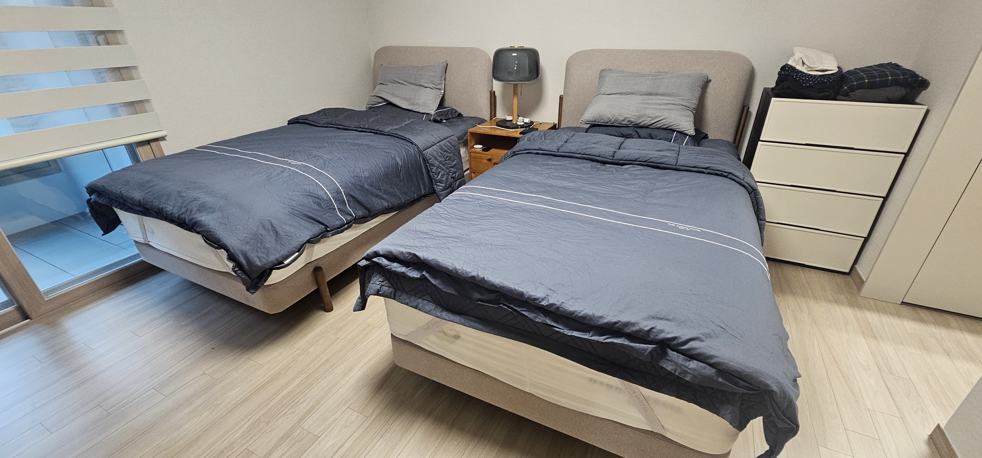 안방은 가장 소프트한 하이브리드7 매트리스에 원목다리에 편안한 느낌의 등받이가 있는 오팔로 프레임으로 2개씩 구매했습니다.