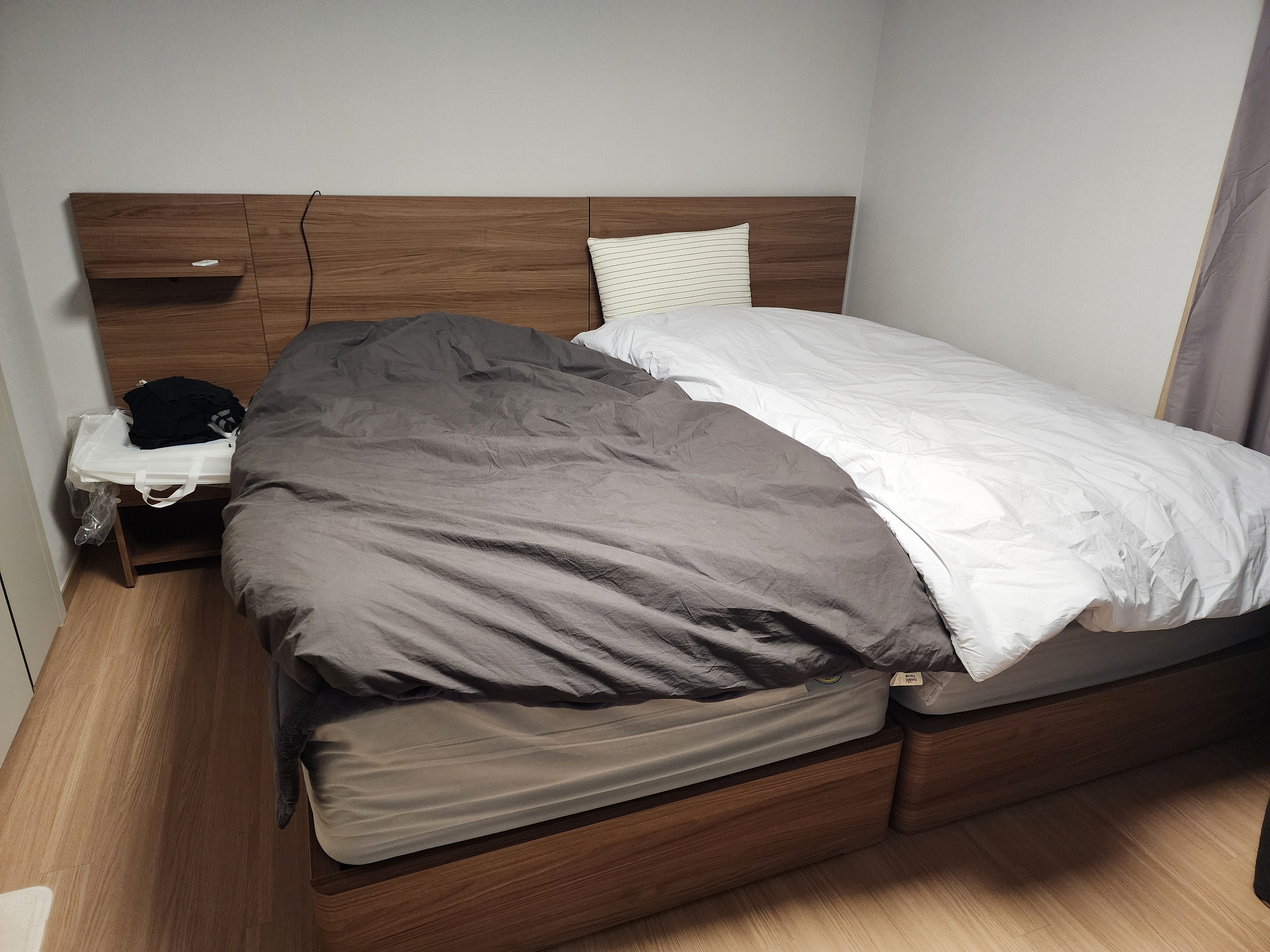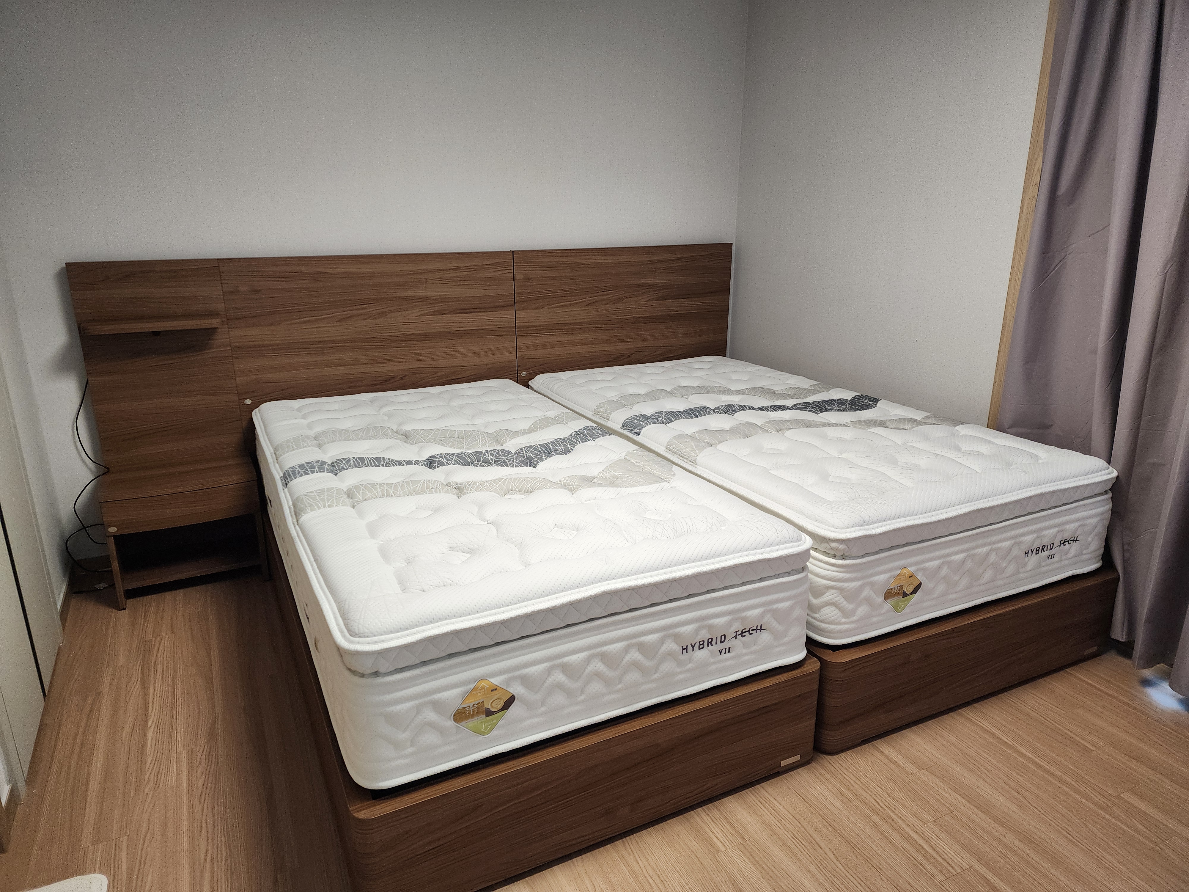 평소 잠은 정말 편하게 자야한다는 주의라 신혼이지만 슈퍼싱글 2개를 선택했습니다. 침대는 직접 누워봐야 알수 있어서 울산 가구거리에 있는 씰* / 슬립* / 시몬* / 에이스 총 4개 브랜드를 비교분석했고 가격과 품질과 서비스 및 사은품 모든 조건을 충족하는 브랜드는 에이스 밖에 없었습니다. 에이스 체험관에서 여러 매트리스 체험해보고 결과적으로 하이브리드 테크 7과 국민프레임 월넛 색상을 선택 했습니다. 심플한 프레임 디자인과 고급진 월넛 색상으로 디자인은 질리지 않고 누웠을때 마치 구름위에 누운듯한 (구름위에 누워본적 없음^^) 편안함으로 매일매일 꿀잠 자고 있습니다. 비록 2인가구의 신혼집이라 안방에 슈퍼싱글 침대 두개를 놓으니 방이 가득차긴 하지만 에이스 침대 두개로 온전히 수면에만 집중할 수 있어 더욱 좋았습니다!