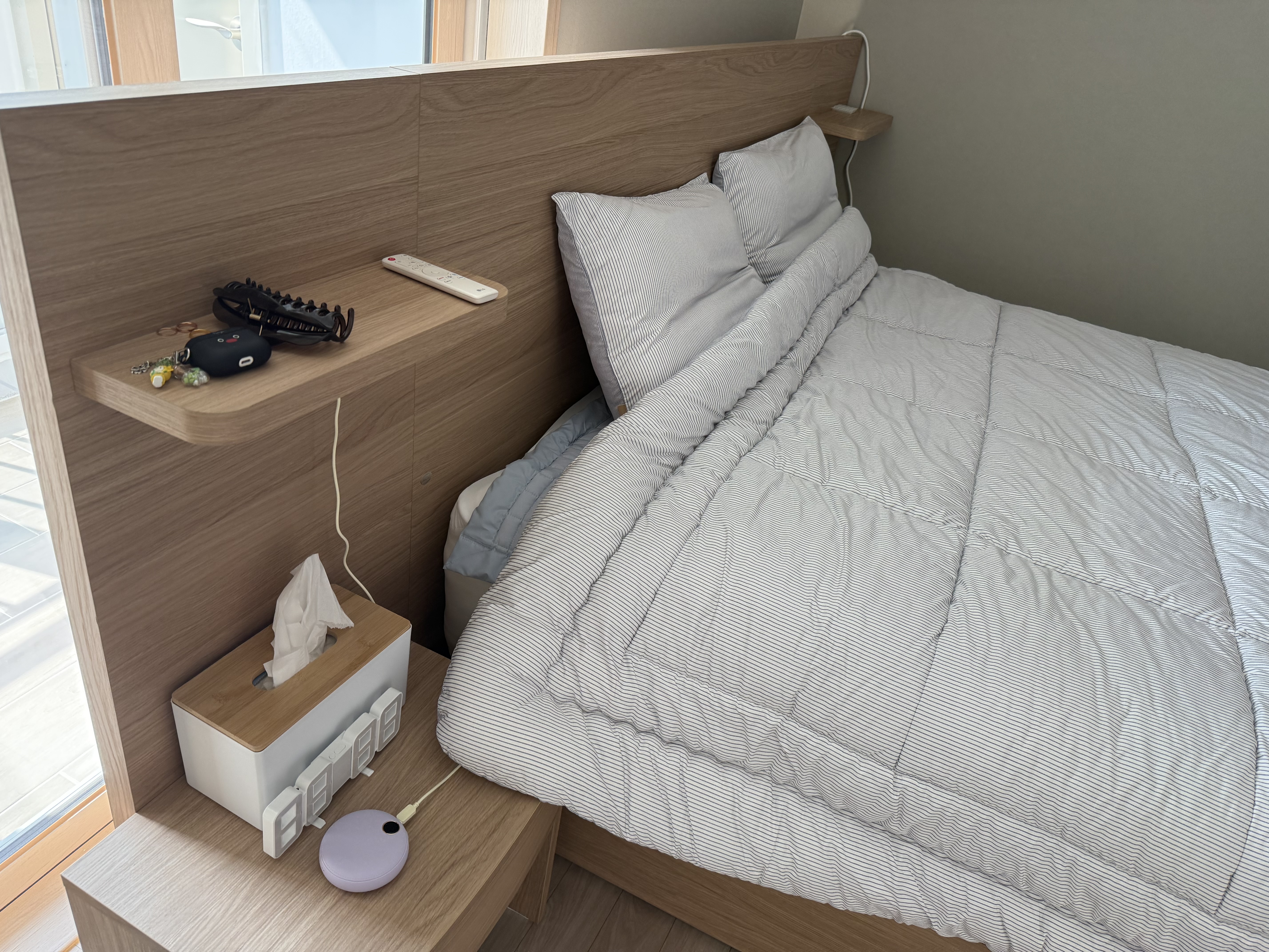 그런데 신축 아파트는 무조건 사이즈 괜찮을거라 하셔서 구매했는데 저희집 안방은 다른 신축에 비해서 작게 빠졌더라고요ㅜ 그래서 원하는 방향으로 두지 못해서 아쉽습니다. (제가 실측 안한 잘못이긴 하지만요ㅜ) 암튼 매트리스랑 프레임 다 너무 예뻐요~~