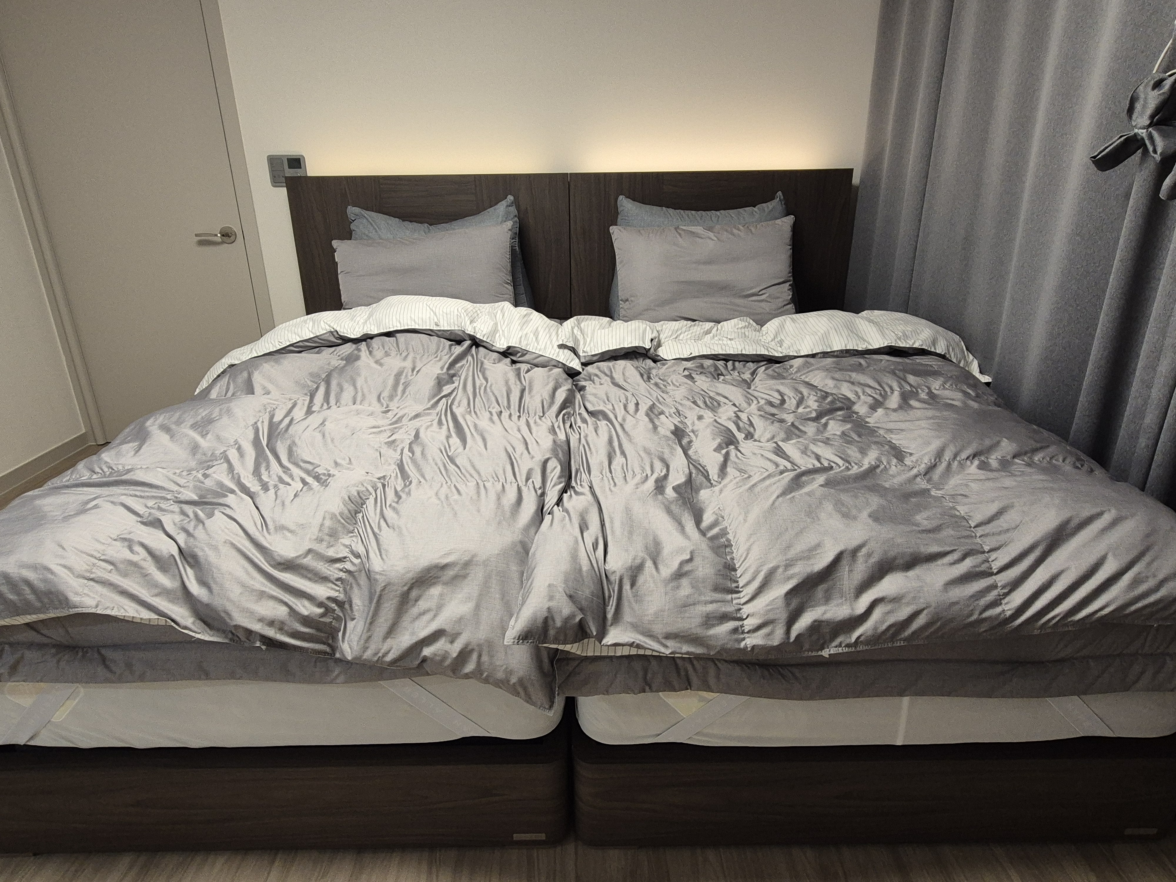 저의 로망이 호텔형 침대였는데 결혼 10년만에 새집으로 이사를 가면서 로망을 실현하게 되었네요. 세트로 산 바론트 프레임도 고급스럽고 헤드부분에 휴대폰 충전도 가능해서 편리합니다. 바닥 마루 색깔이 짙어서 이것 또한 집이 너무 어두워 보일까 걱정했지만 막상 설치 하고보니 괜한 걱정이었던듯 너무 예쁘네요.