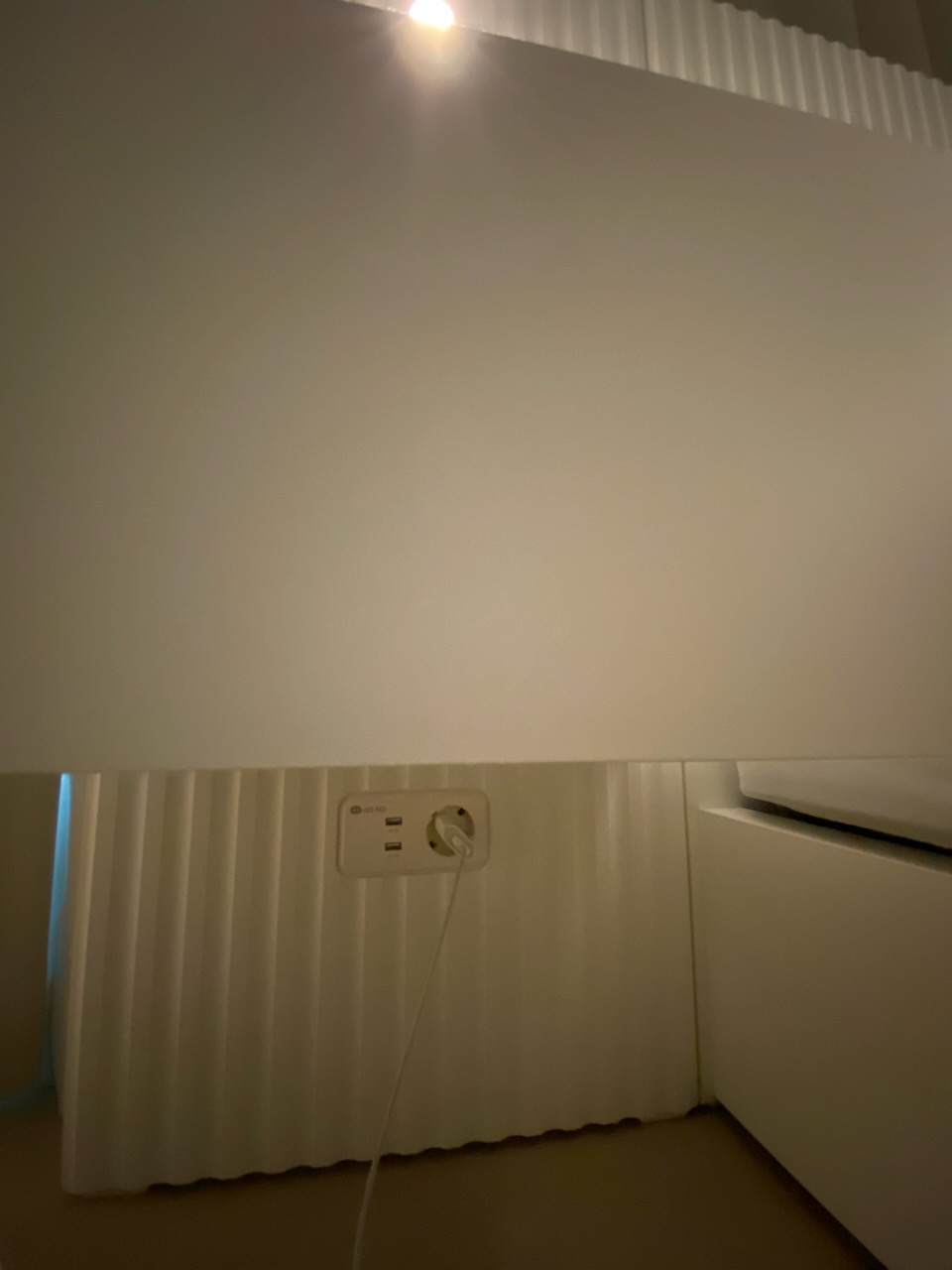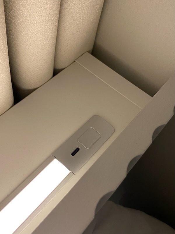 템바보드 디자인이 세련돼 보여 아르코 침대 프레임을 선택했는데 탁월한 선택이였습니다. 협탁 조명과 침대 헤드 조명이 있어 침실 분위기를 호텔처럼 고급스럽게 만들어 줍니다. 협탁 조명은 터치형에 180도 가까이 회전이 가능하며 3단 밝기 조절이 됩니다. 침대 헤드 뒤 조명 역시 터치로 원하는 만큼 밝기 조정이 가능해서 편리했습니다. 또한 협탁과 헤드에 모두 콘센트가 있어 디자인과 실용성을 모두 잡은 침대라고 느껴졌습니다.