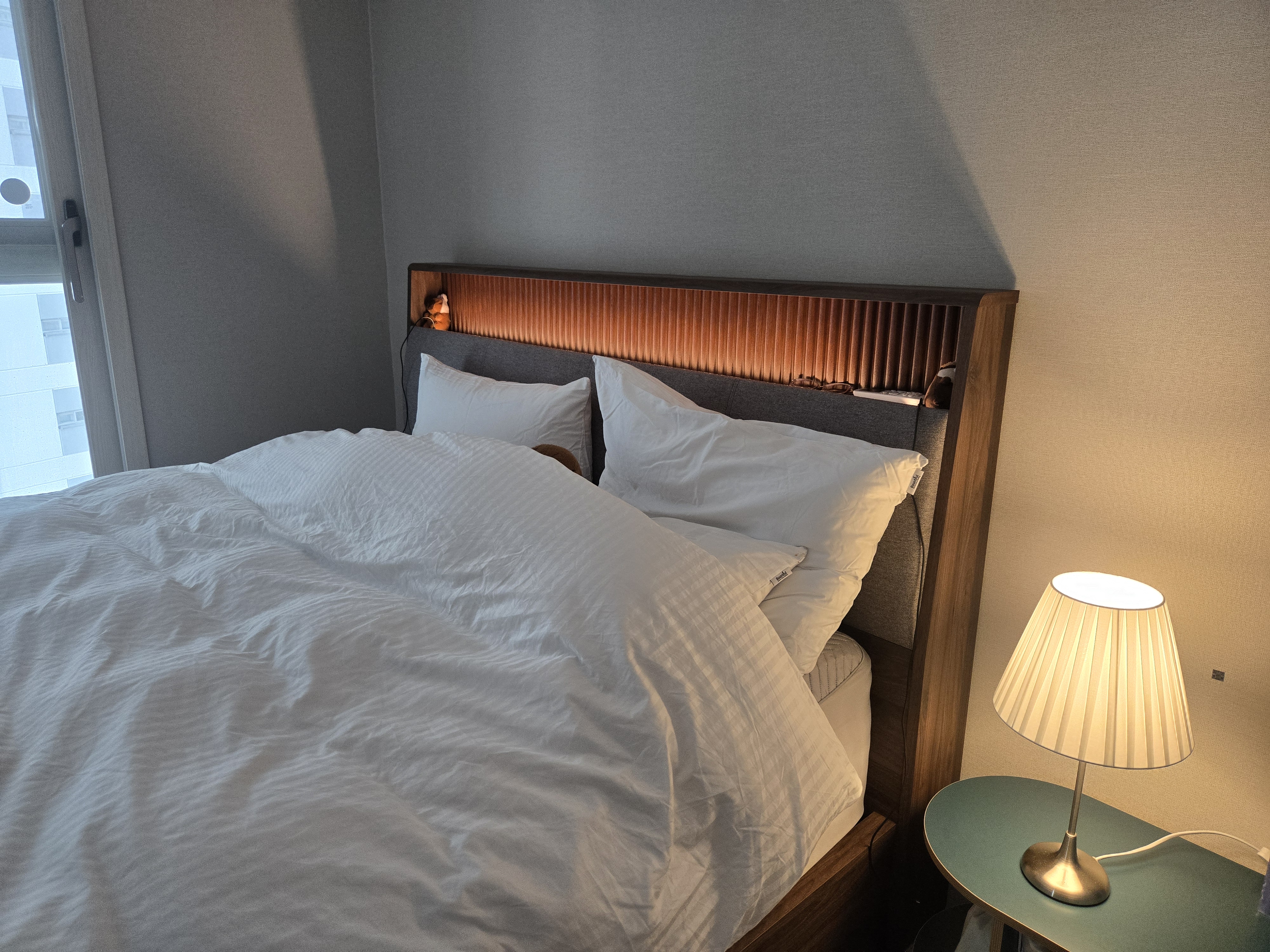 침대 헤드는 일부러 조명 있는 형태로 선택했는데 조작이 간편하고 은은하게 방 분위기를 밝혀주어서 좋습니다! 그리고 월넛 색상을 선택했는데 집 분위기가 차분하고 호텔스러워졌습니다! 어떤 이불을 놓아도 잘 어울릴 듯싶습니다.