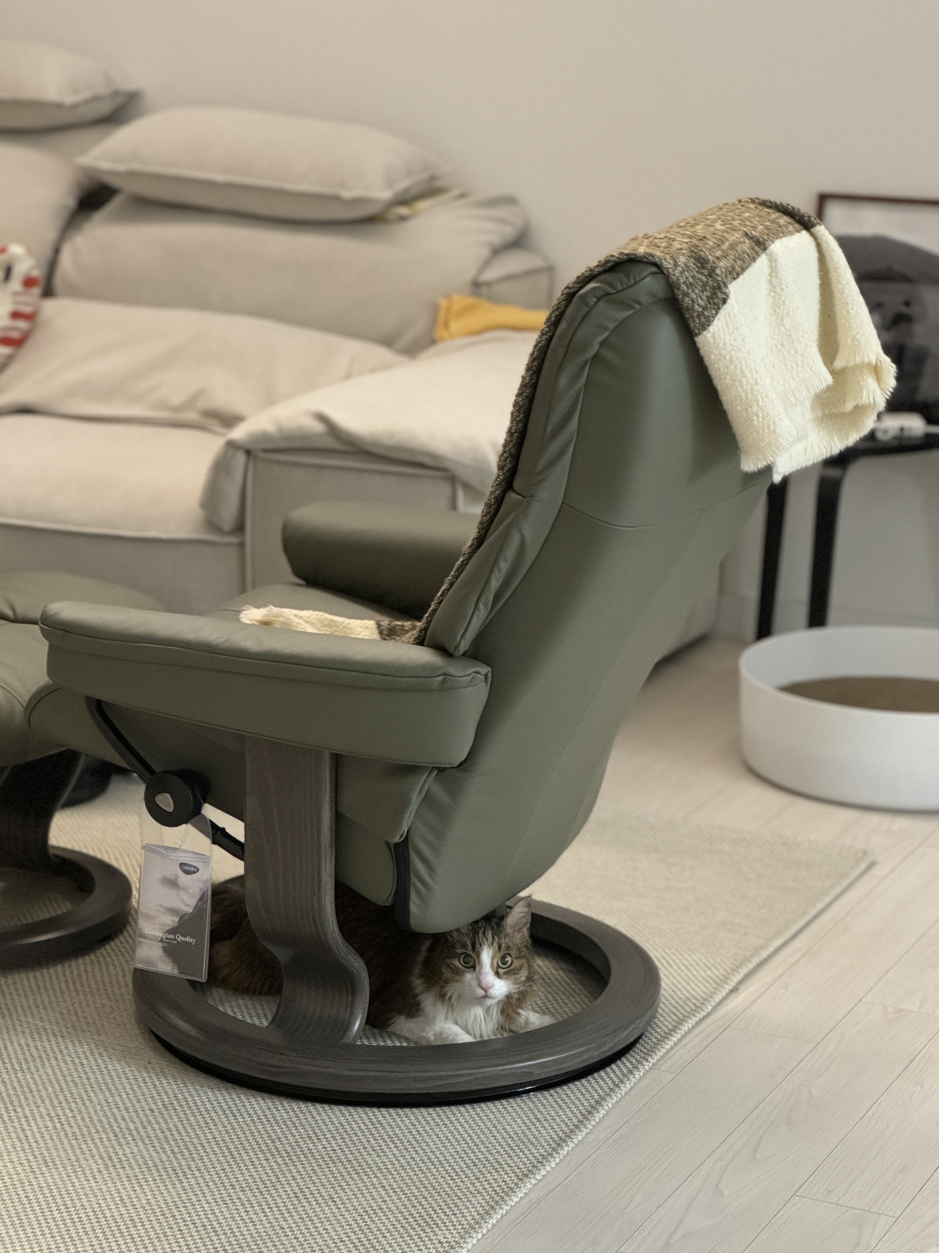 예전부터 넘사벽으로 좋은건 알았지만 갖지못했던 스트레스리스... 출산이 임박해 수유의자를 고민하다 장난식으로 백화점 에이스침대 매장 입구의 스트레스리스에 잠시 앉았다가 홀린것처럼 상담을 받게 되었습니다. 너무 편해서 구름위에 누운 것 같았고, 다른 몇백만원짜리 리클라이너들과 비교가 안되는 느낌이었습니다. 심지어 디자인도 가장 예쁘고 가죽 색도 다양해서 저희 집 컬러에 어울리는 그린 색으로 골랐습니다. 빠른 배송도 너무 편했고, 바닥이 묵직해 넘어가지않으면서도 혼자 위치도 바꿀 수 있을만큼의 무게는 되어서 좋았습니다. 퇴근하면 여기서 충전하는게 낙이 될 만큼 그냥 몸에 착 감깁니다. 고양이도좋아해요.