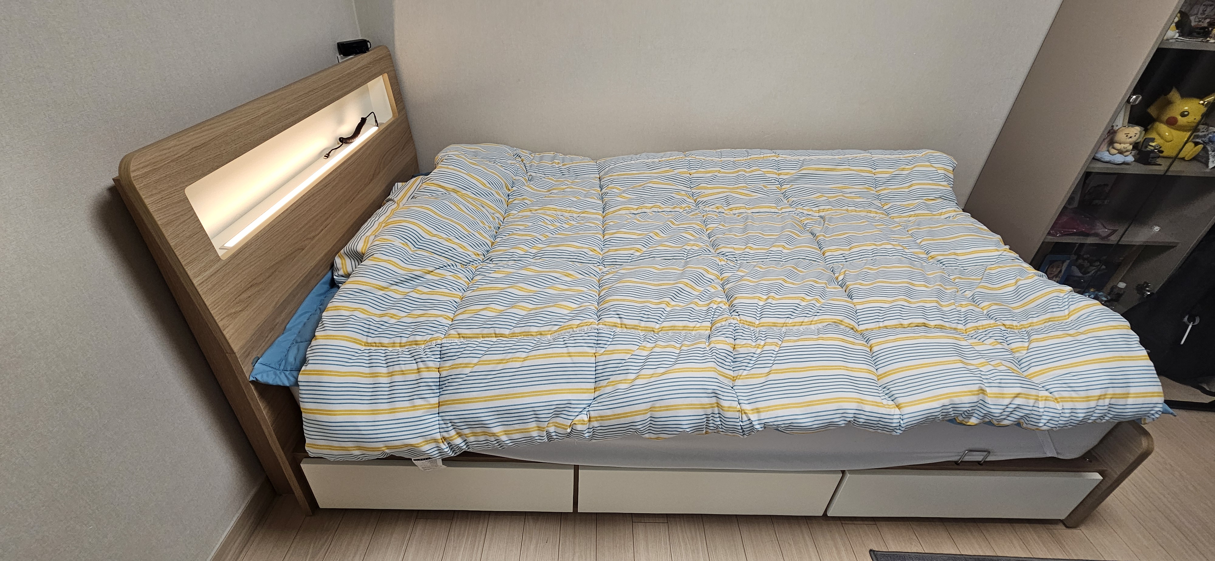 사진처럼 깔끔한 디자인에 헤드 부분 간접조명까지 있어서 방 분위기가 한층 더 밝고 아늑해졌어요. 특히 서랍형 프레임이라 공간 활용도 좋아서 아이 방 정리에도 큰 도움이 되네요.