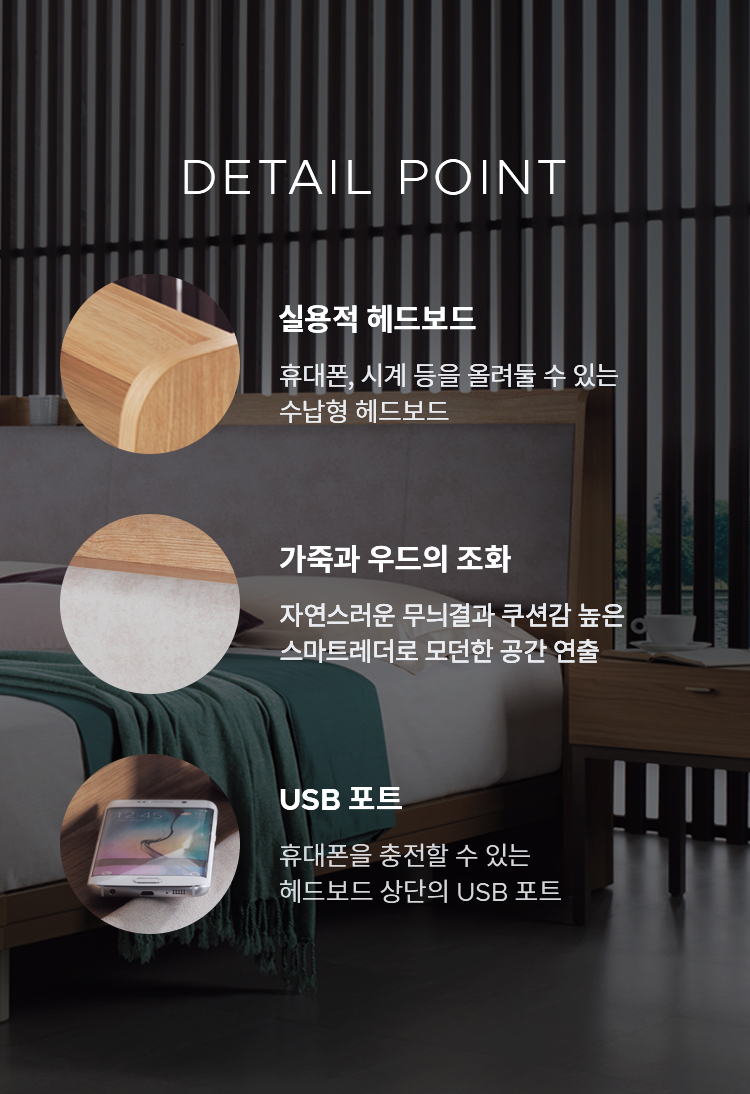 우드컬러와 가죽질감의 헤드보드가 조화로운 침대